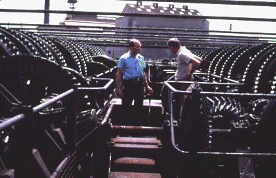 ![]() | On the very top of the lift, the operator explains how it works to Pete. (Operator in blue shirt). Immediately behind his knees is the box with the small electric motor that ran the whole lift. |