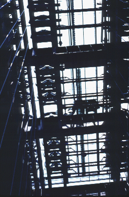 ![]() | This is a view from inside the lift (in "Golden Eagle") with camera pointed straight up. Overhead are the pulleys, and the rectangular shape is the motor box. The light is shining on the cables at left hand side of the photo. |